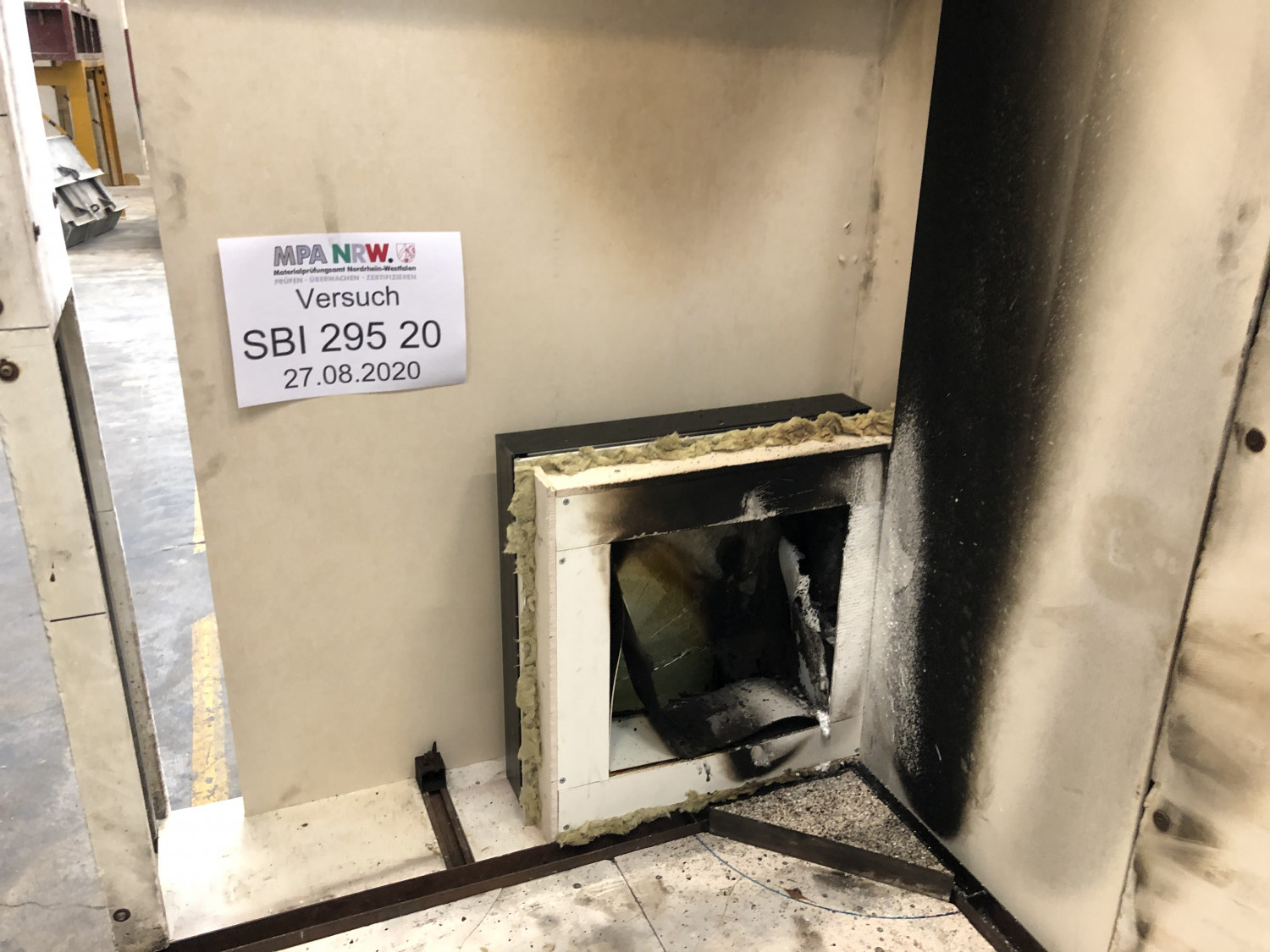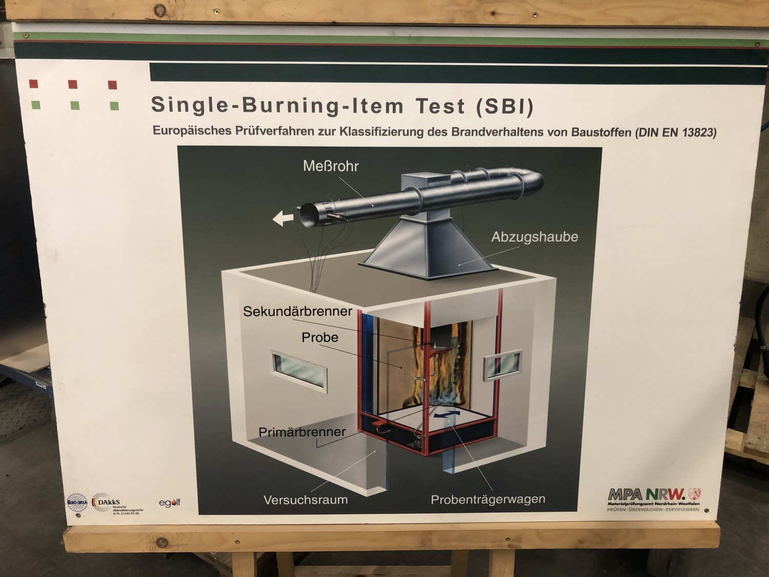 Diese europäische Brandschutzklasse wird, wie bereits erwähnt, auf der Grundlage von Prüfverfahren ermittelt. Um festzustellen, ob ein Bauprodukt in die Euro-Klasse B, C oder D fällt, sind zwei Prüfungen erforderlich: (1) der so genannte Small Flame Test und (2) der Single Burning Item (SBI)-Test.
