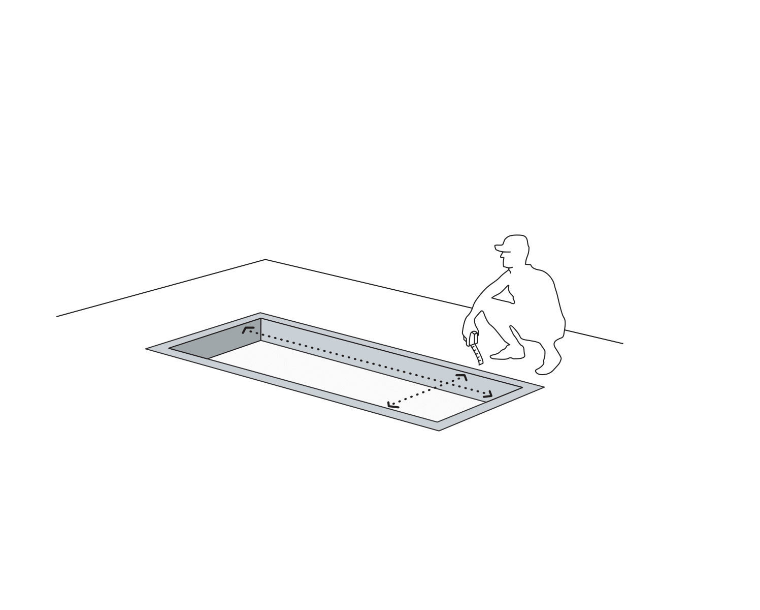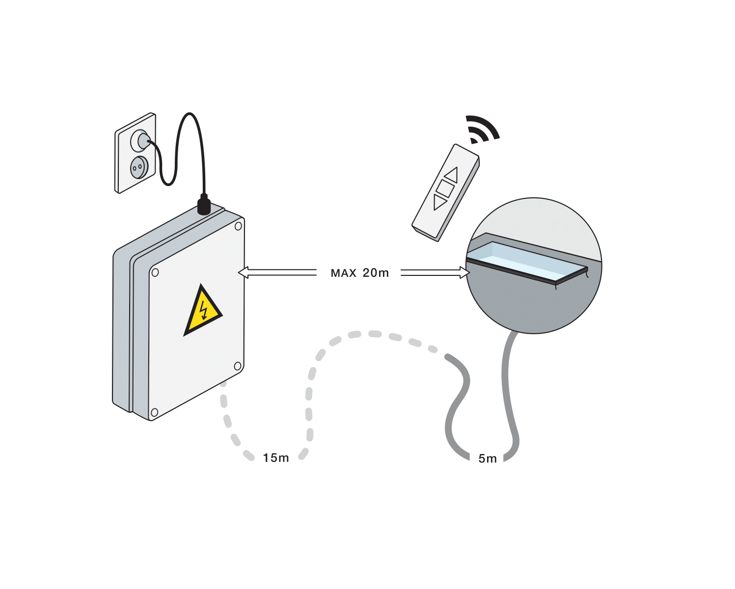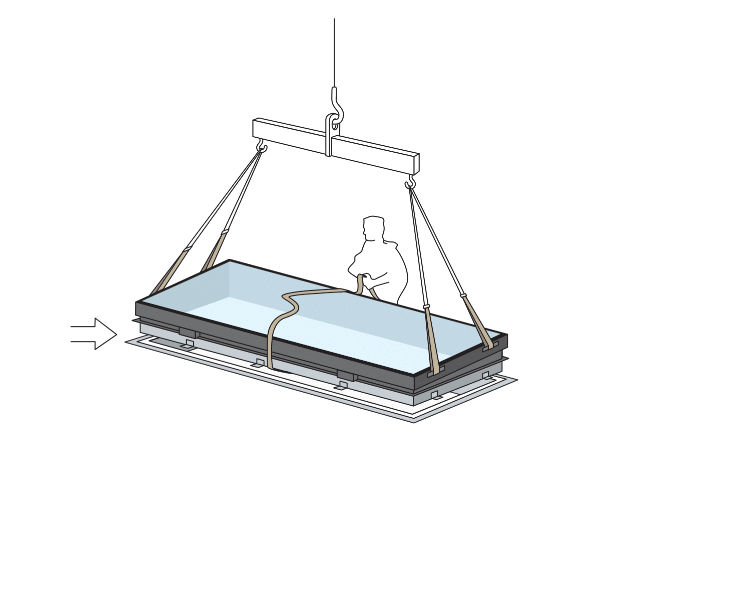 Wenn die Option einer Durchführung in der Bestellung enthalten ist, stellen Sie sicher, dass während der Installation des Oberlichts ein Stromkabel durch die Durchführung gezogen und zu einer Steckdose im Inneren geführt wird. Die nachträgliche Verlegung des Kabels kann schwierig sein.