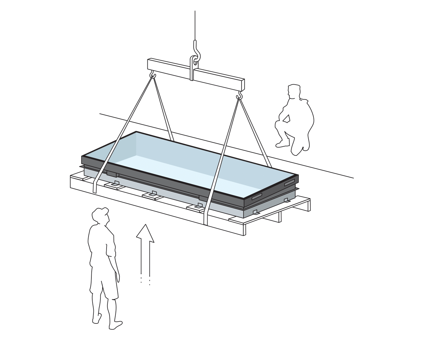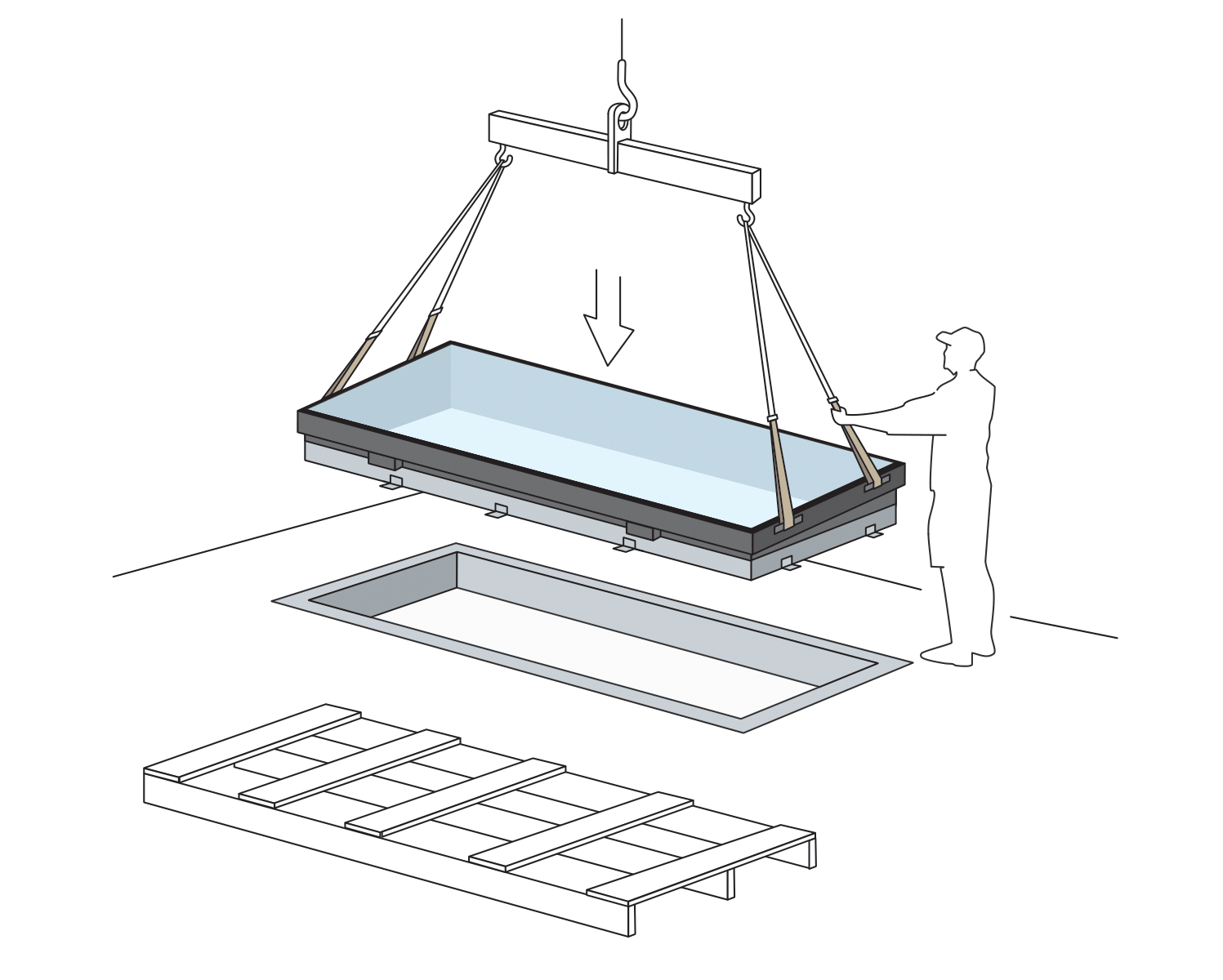 Das Produkt, unabhängig von Typ und Modell, wird immer in einem Stück auf einer Holzpalette geliefert. Eine häufig gestellte Frage ist, wie groß die Dachöffnung sein sollte. Auch das ist einfach. Die mitgeteilten Produktmaße sind die Laibungsmaße, die mit den Sparrenmaßen übereinstimmen. Dies wird auch direkt klar auf der technische Zeichnung.